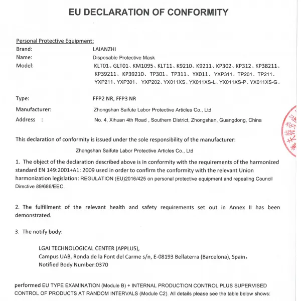 Mastile sunt realizate in conformitate cu standardele EN 149:2001 + A1:2009 si CE 0370