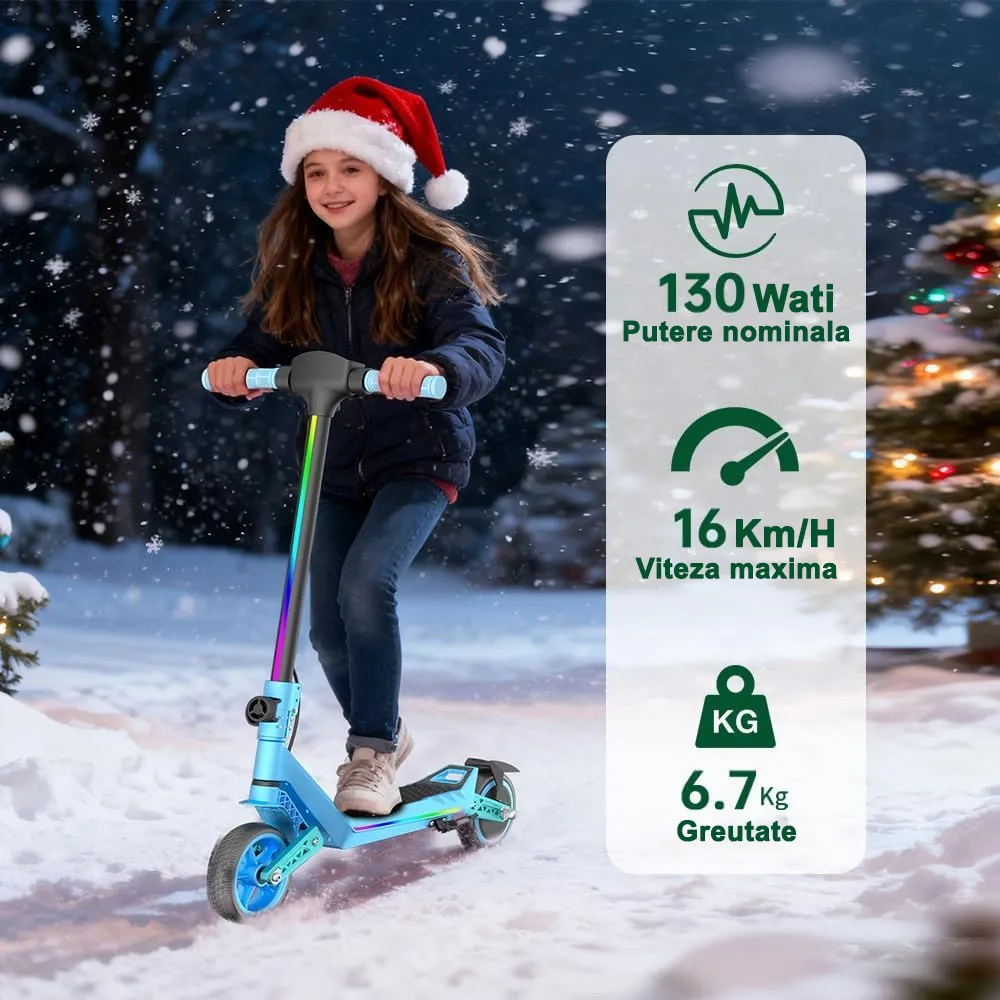 Trotineta electrica RYDE U8 este special conceputa pentru copiii cu varsta intre 6 si 12 ani, oferind un echilibru excelent intre distractie, control si siguranta. Cu viteza limitata la maximum 16 km/h (are 3 viteze si merge in functie de setare cu 8 / 12 / 16 km/h) si structura ranforsata, este ideala pentru invatare progresiva si utilizare sub supravegherea adultilor, in parc sau pe alei.